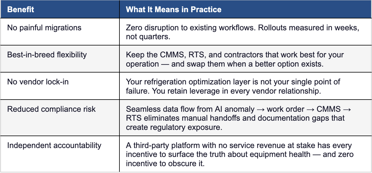 The next time a vendor tells you their refrigeration management platform requires replacing your CMMS, switching your RTS, hiring more employees, changing your workflows, or replacing your contractor network — ask yourself who benefits from that requirement.